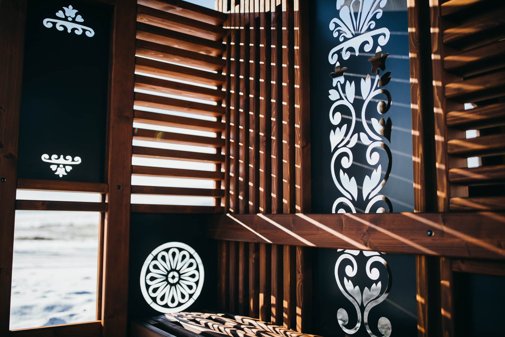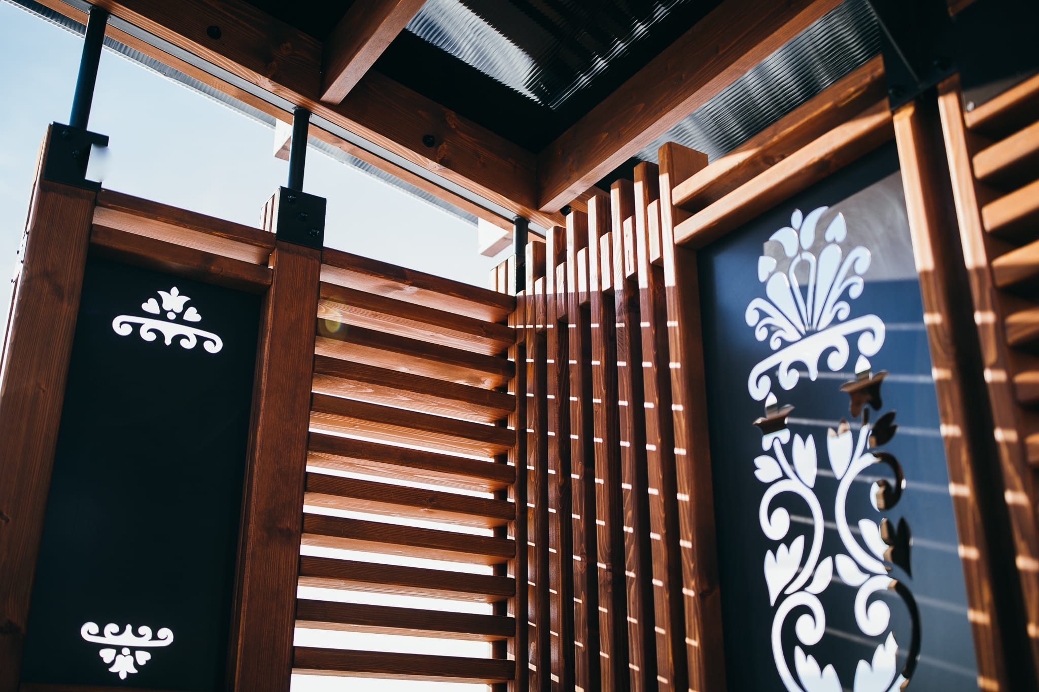 A lézerrel kivágott fém dekorlapok finom fény-árnyék játékát nézve elidőzhetünk gondolatainkban a járatunkra várva.
