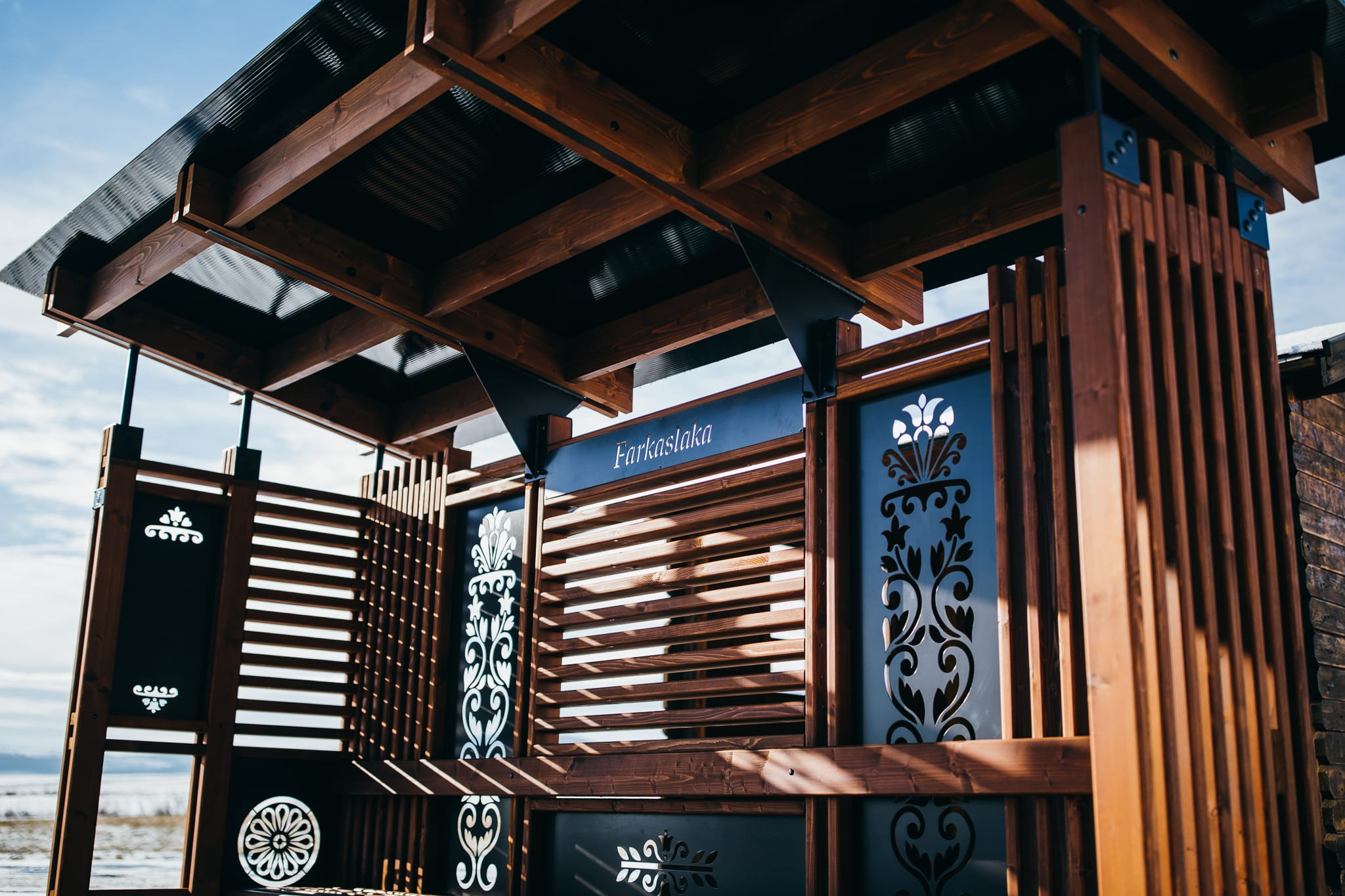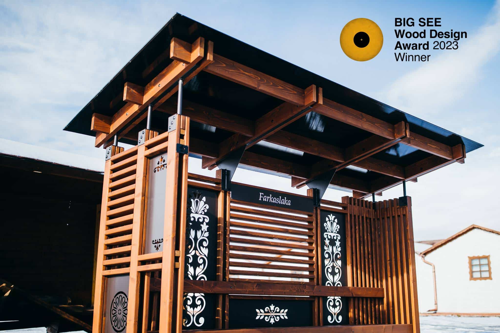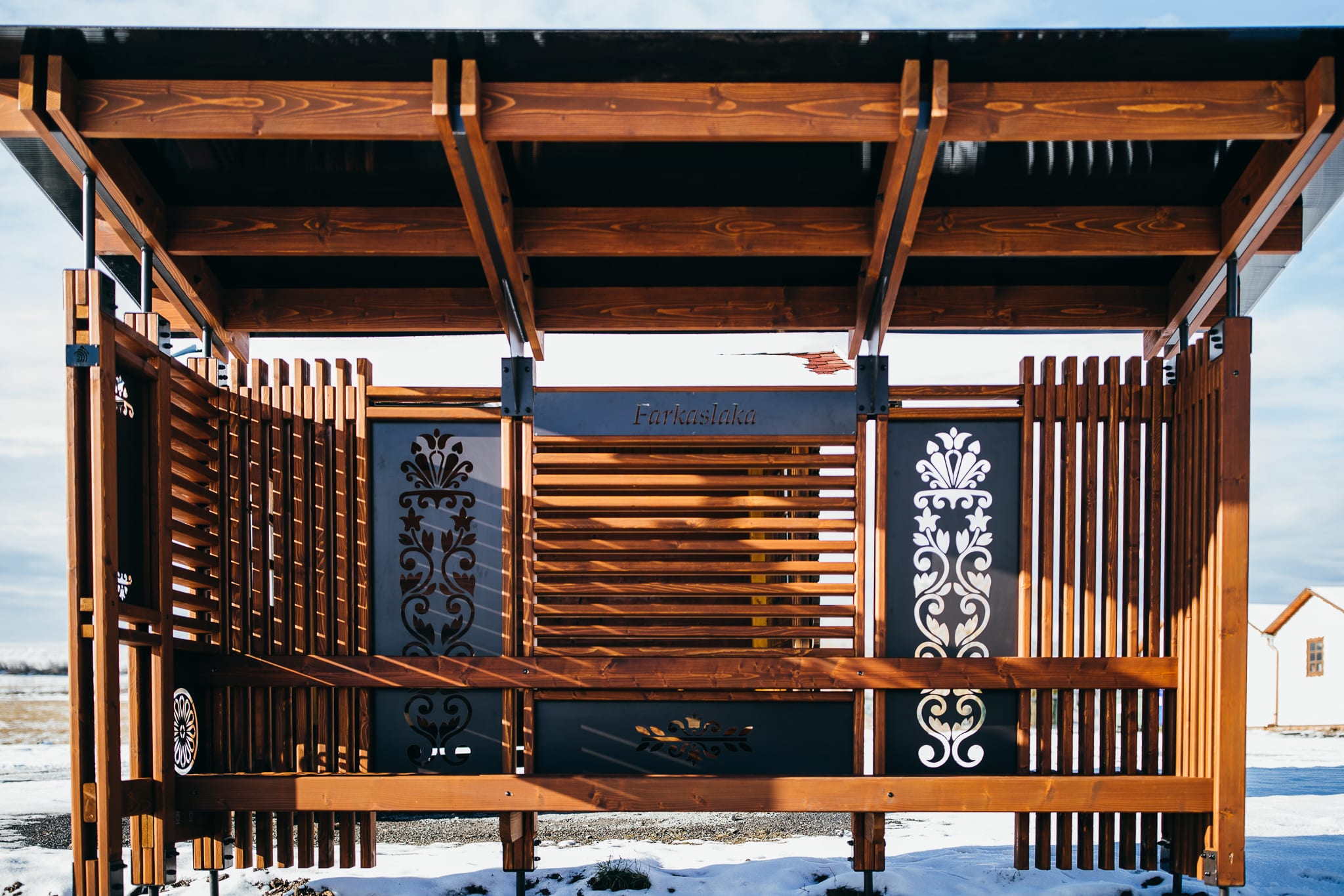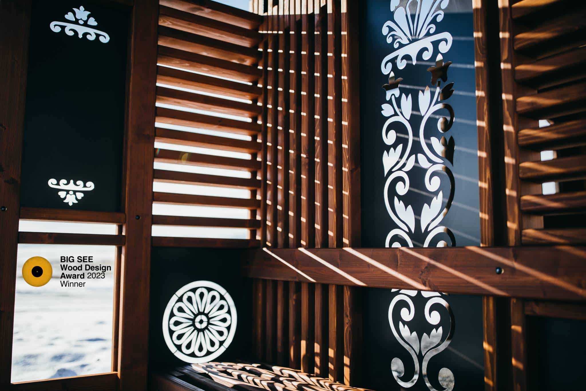 A formailag letisztult, minimalista fa szerkezetbe keretezett díszítő motívumok frissességet, lendületet adnak az összképnek. A népi motívumkincs modern kontextusba helyezésével az itt élő emberek kettős életstílusa is megfogalmazódik: egyszerre korszerű, komfortos és autentikus, önazonos. A tervezés során gondunk volt a névtábla és a menetrend helyének kialakítására is.